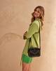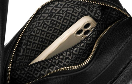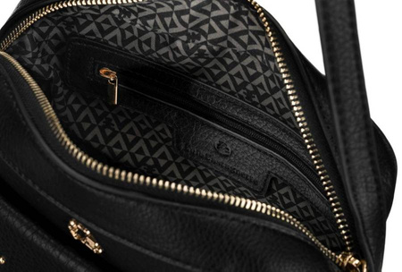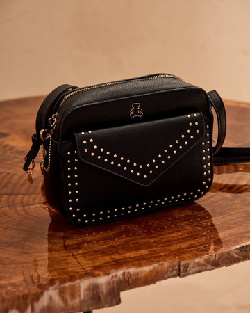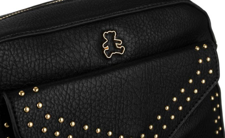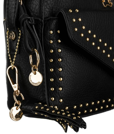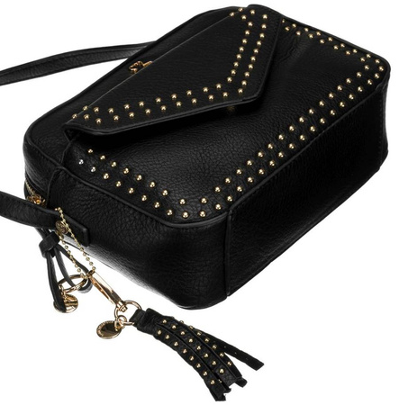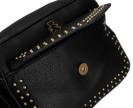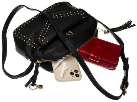 - Jednokomorowa listonoszka odszyta z trwałej i przyjemnej w dotyku eko skóry zdobionej na froncie dżetami. Torebka wyposażona w dwie wewnętrzne kieszonki na drobiazgi. Ponadto na froncie kieszonka zamykana magnetyczną klapką a na rewersie klasyczny schowek