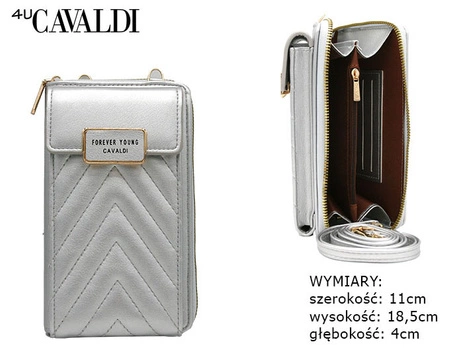 - Pikowana srebrna mała torebka damska - portfel 2w1 odszyta ze skóry ekologicznej. Torebka wyposażona w kieszeń na telefon oraz klasyczne wnętrze portfela - 4 przegródki na karty, 2 kieszonki na banknoty i 1 na bilon. Saszetka zawieszona na odpinanym pasku
