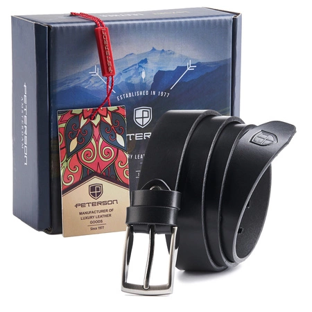 Wąski pasek męski ze skóry naturalnej. Zakończony klasyczną, metalową klamrą. Wyposażony w szlufki stabilizujące. Akcesorium zapakowane w markowe pudełko.