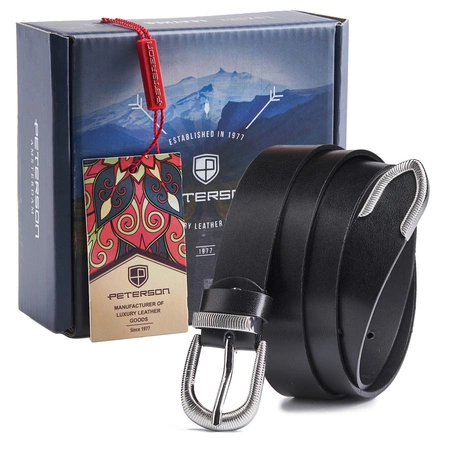- Wąski, damski pasek z wysokojakościowej skóry naturalnej. Zdobiony żłobionymi okuciami. Akcesorium z tradycyjną, metalową klamrą oraz szlufkami stabilizującymi. Do regulacji obwodu otwory kaletnicze. Pasek zapakowany w markowe pudełko.
