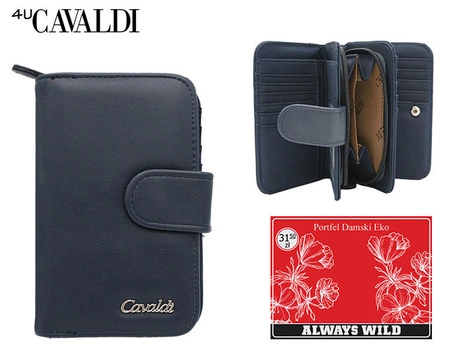 - Granatowy portfel damski ze skóry ekologicznej. Model pionowy zamykany na zatrzask i suwak. Portfel wyposażony w klasyczne wnętrze na gotówkę i rozbudowaną sekcję na karty i dokumenty aż 23 przegródki. Portfel mieści dowód rejestracyjny.