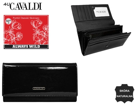 - Klasyczny pojemny portfel damski w czarnym kolorze wykonany z lakierowanej skóry naturalnej. Model z rozbudowaną sekcją na karty i dokumenty - 10 przegródek oraz tradycyjnym wnętrzem na gotówkę. Portfel mieści dowód rejestracyjny.