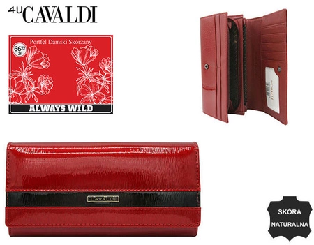 - Duży czerwony portfel damski odszyty z lakierowanej skóry naturalnej zdobionej czarnym akcentem. Model wyposażony w 10 przegródek na karty, schowek na dokumenty oraz klasyczną sekcję na gotówkę - kieszeń na bilon zamykana suwakiem.