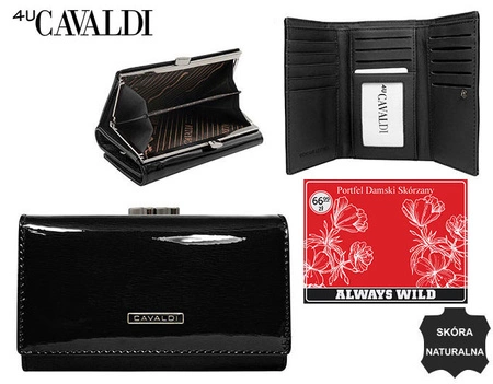 - Lakierowana, skórzana czarna portmonetka damska o średnich gabarytach. Portfel wyposażony w aż 17 przegródek na karty i dokumenty i klasyczne wnętrze na gotówkę, w tym zewnętrzną zamykaną na bigiel kieszeń na bilon. Mieści dowód rejestracyjny