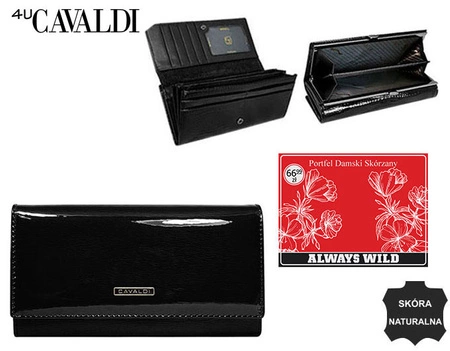 - Czarna lakierowana duża skórzana portmonetka damska. Portfel z rozbudowaną sekcją na karty, schowkiem na dokumenty o większym formacie i klasyczną sekcją na gotówkę, w tym 2 kieszeniami na bilon - wewnętrzna na suwak, zewnętrzna zamykana na bigiel.