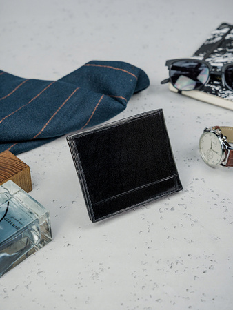- Poziomy portfel męski bez zewnętrznego zapięcia. Wykonany z gładkiej skóry naturalnej wysokiej jakości. Wewnątrz sekcja na karty i dokumenty z przegródką na dowód rejestracyjny. Kieszonki na gotówkę klasyczne. Portfel z system RFID Stop.