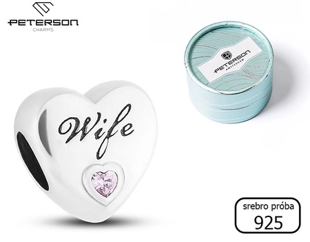 Charms ze srebra w kształcie serca ozdobiony cyrkoniami oraz napisami: Wife PETERSON® CHP-014 w ofercie hurtowej