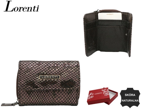 - Mały, skórzany, brązowy portfel damski na gotówkę. Portfel wykończony niecodziennym designem i błyszczącą poświatą. Akcesorium z dwoma przegródkami na banknoty i zewnętrzną kieszonką na bilon zamykaną suwakiem. RFID STOP. Zapakowany w pudełko producenta