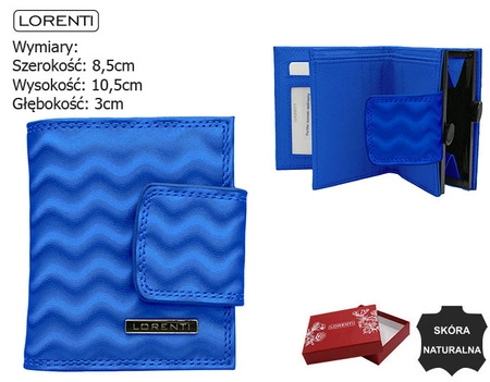 - Niebieski, skórzany, mały portfel damski zdobiony błyszczącym wzorem imitującym fale. Portfel w orientacji pionowej zamykany na zatrzask i bigiel. Wyposażony w rozbudowaną sekcję na karty i klasyczne wnętrze na gotówkę. Ochrona RFID. Pudełko prezentowe