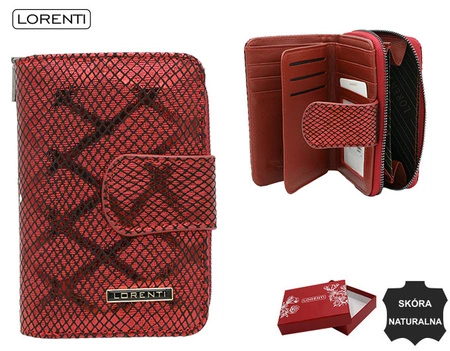 - Czerwony, skórzany portfel damski wykończony błyszczącym wzorem. Model pionowy wyposażony w rozbudowaną sekcję na karty i dokumenty-13 przegródek oraz klasyczne wnętrze na gotówkę - zewnętrzna zamykana na suwak kieszeń na bilon. Mieści dowód rejestracyjny
