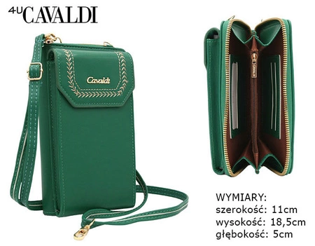 - Zielona mała torebka-portfel 2w1 odszyta ze skóry ekologicznej. Model pionowy zdobiony złotymi okuciami. Torebka wyposażona w kieszeń na telefon zamykaną klapką na zatrzask i klasyczne wnętrze portfela typu piórnik. Długi odpinany pasek w komplecie