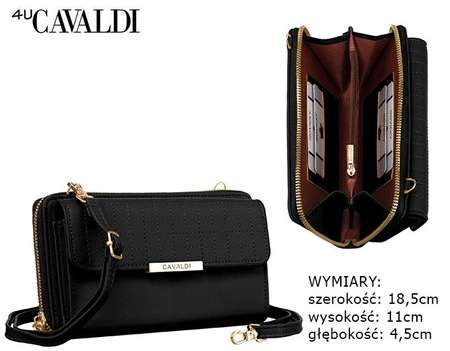 - Czarna mała torebka damska portfel 2w1 odszyta ze skóry ekologicznej. Model poziomy wykończony złotymi okuciami. Listonoszka wyposażona w kieszeń na telefon - zamykana ozdobną klapką z zatrzaskiem i klasyczną sekcję portfela na karty i gotówkę.
