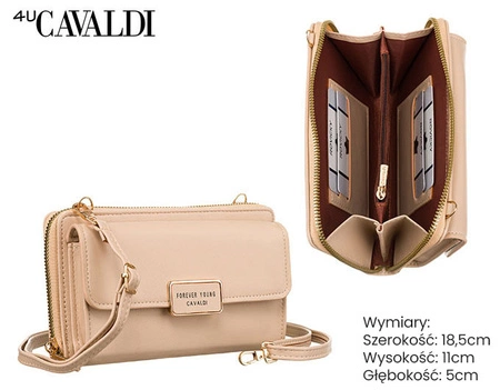 - Mała listonoszka - portfel typu piórnik 2w1 w beżowym kolorze zdobionym złotymi okuciami. Model poziomy odszyty ze skóry ekologicznej. Torebka wyposażona w kieszeń na telefon, sekcję portfela na gotówkę i 4 przegródki na karty. Długi pasek na ramię.