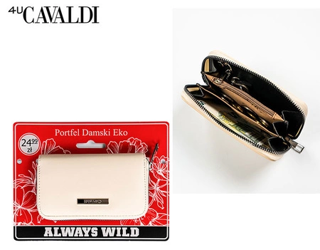- Mały, lekko połyskujący, beżowy portfelik damski na gotówkę odszyty ze skóry ekologicznej. Model poziomy zamykany na suwak. Wyposażony w trzy przegródki na banknoty, jedną na bilon i klasyczne kółeczko na klucze. 2w1 portfel - etui.
