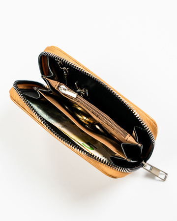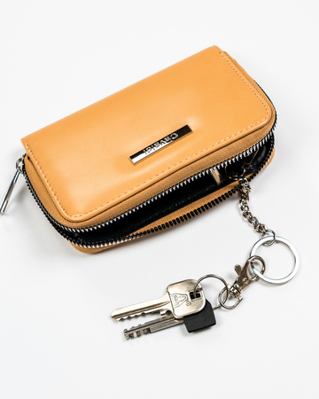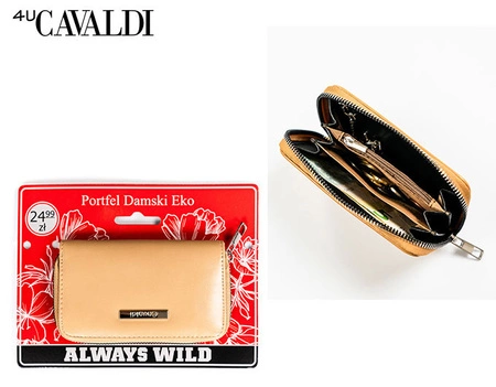 - Beżowy, lekko połyskujący, mały portfel damski na gotówkę odszyty ze skóry ekologicznej. Portfelik wyposażony w trzy przegródki na banknoty, jedną na bilon i klasyczne kółeczko na klucze. 2w1 portfel - etui na klucze.