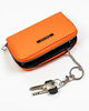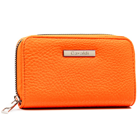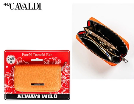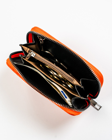 - Mały pomarańczowy portfel damski na gotówkę i klucze. Model poziomy zamykany na suwak wykonany ze skóry ekologicznej wykończonej ziarnistą fakturą. Wyposażony w trzy przegródki na banknoty i jedną na bilon. Dodatkowo kółeczko na klucze. 2w1 portfel - etui