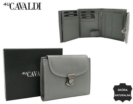 - Mały, skórzany portfel damski w szarym kolorze wykończony srebrnymi okuciami. Portfel z rozbudowanym wnętrzem na karty i dokumenty o nieco większym rozmiarze - 14 przegródek oraz klasyczną sekcją na gotówkę. Ochrona RFID STOP. Pudełko producenta.