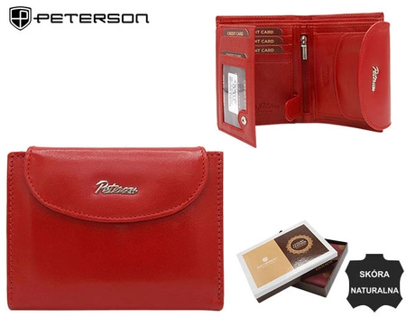 Poziomy portfel damski z zapięciem na zatrzask. Wykonany z jednolitej skóry naturalnej. Wewnątrz zakładki na karty i dokumenty. Sekcje na gotówkę standardowe z przegródką na monety zamykaną zatrzaskiem.