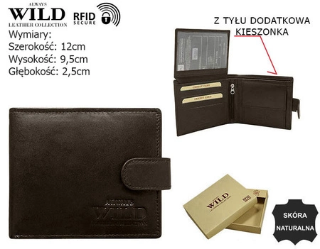 - Portfel męski z bydlęcej skóry naturalnej. Zamykany zatrzaskiem. Wyposażony w zakładki na karty i kieszenie na większe dokumenty — jedna z nich jest przezroczysta. W centralnej części portfela zasuwany schowek. Akcesorium z zabezpieczeniem RFID Protect.