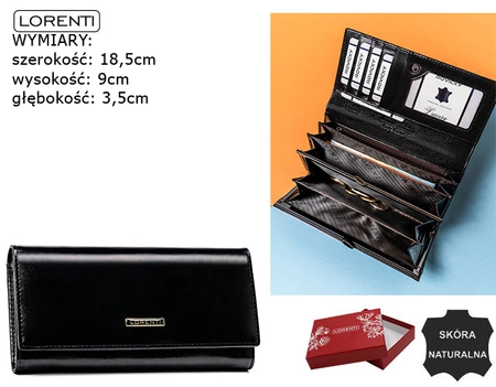 - Czarny, duży, skórzany portfel damski. Akcesorium wyposażone w 10 przegródek na karty i dokumenty, klasyczną sekcje na gotówkę, w tym zamykaną na bigiel kieszonkę na bilon i schowek na suwak. Portfel mieści dowód rejestracyjny. RFID. Pudełko prezentowe.