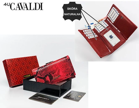 - Czerwony portfel damski zamykany na bigiel i zatrzask. Wykonany ze skóry naturalnej i ekologicznej, ozdobiony motywem imitującym skórę węża. Wyposażony w 13 miejsc na karty.