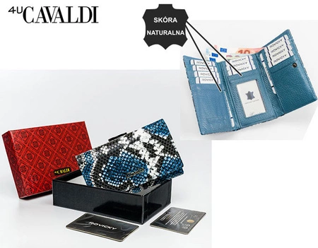 - Portfel w niebieskim kolorze z motywem skóry węża. odszyty z najwyższej jakości skóry naturalnej i ekologicznej. Środek portfela jest wykończony skórą naturalną, zaś strona zewnętrzna to kolorowa skóra eko. Zamykany na zatrzask i bigiel.