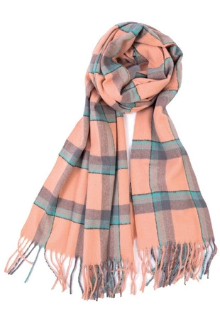 - Szalik damski z tkaniny akrylowej zawierającej domieszki wiskozy i wełny. Zakończony frędzlami. Tkanina pokryta wzorem kraty. Produkt zapakowany w markową banderolę.