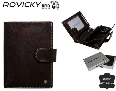 - Elegancki ciemnobrązowy portfel męski z bydlęcej skóry naturalnej. Model pionowy zamykany na zatrzask. Wyposażony w sekcję na gotówkę, w tym kieszeń na bilon typu piekiełko, schowek na suwak i 12 zakładek na karty i dokumenty. Mieści dowód rejestracyjny
