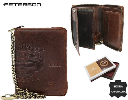 - Pionowy portfel męski ze skóry naturalnej. Wyposażony w wiele wygodnych zakładek na karty oraz duże schowki na dokumenty formatu dowodu rejestracyjnego. Akcesorium zapinane za pomocą suwaka. W zestawie długi łańcuch.
