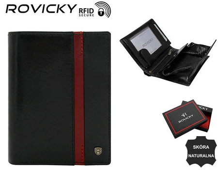 - Pionowy skórzany czarny portfel męski z czerwonym paskiem na froncie. Model bez zapięcia. Wyposażony m.in. w schowek na suwak, 13 zakładek na karty i dokumenty i kieszeń na bilon typu piekiełko. Portfel mieści dowód rejestracyjny. Pudełko producenta. RFID