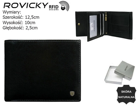 - Czarny, klasyczny, skórzany portfel męski w orientacji poziomej bez zapięcia. Portfel wyposażony w sekcję na gotówkę, schowek na suwak, 13 zakładek na karty, 3 na większe dokumenty i 1 transparentne okienko. Pudełko prezentowe. Ochrona RFID STOP