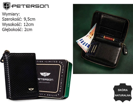 - Duży portfel męski carbon zapinany na zamek błyskawiczny. Wykonany z wysokiej jakości skóry naturalnej o delikatnym wzorze. Wyposażony w ochronny system RFID Protect. Wewnątrz wygodne zakładki na karty i dokumenty oraz sekcje na gotówkę.