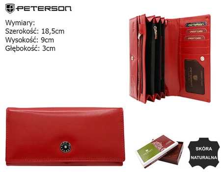 Stylowy damski portfel z klasycznym zapięciem na zatrzask. Na przedniej części znajduje się okrągłe logo marki PETERSON z elegancką cyrkonią w centrum. Po otwarciu mamy: