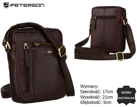 - Listonoszka męska ze skóry naturalnej. Na froncie posiada dwie oryginalnie usytuowane kieszenie na suwaki oraz eleganckie logo marki Peterson w formie metalowego emblematu i subtelnego tłoczenia. Wyposażona w wygodny, regulowany pasek.