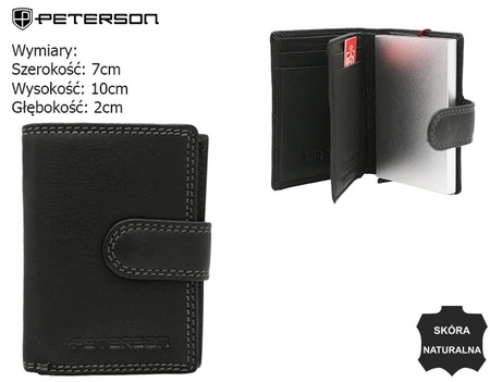 Portfel wyposażony jest w solidne zapięcie na zatrzask, które chroni przed przypadkowym otwarciem. Na zewnętrznej stronie znajduje się wytłoczone logo marki Peterson, podkreślające prestiż produktu.