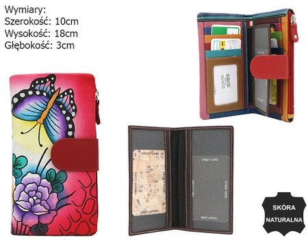 - Duży, ręcznie malowany portfel damski ze skóry naturalnej. Ozdobiony motywem kwiatów i motyli. Zaprojektowany w orientacji pionowej z zewnętrznym zapięciem na zatrzask. Posiada wyjmowane etui na karty i dokumenty.
