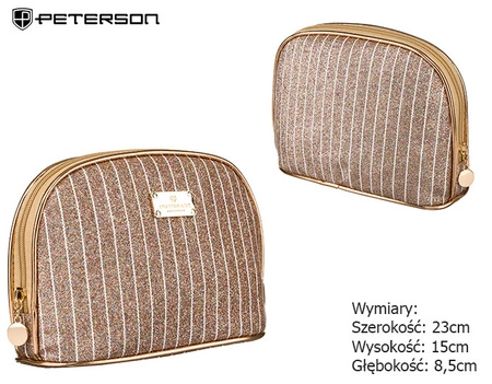 - Brokatowa kosmetyczka podróżna jednokomorowa we wzór w paski. Ozdobiona laminowaniem i okuciami w kolorze różowego złota. Na froncie posiada dużą, złotą plakietkę z logiem marki Peterson®.