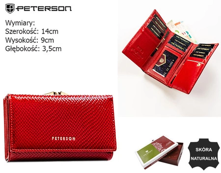 - Elegancki portfel damski marki Peterson, wykonany z wysokiej jakości skóry naturalnej. Posiada liczne przegródki na karty, gotówkę i dokumenty. Całość zapakowana w stylowe pudełko – idealny na prezent.