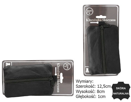 - Czarne małe praktyczne etui na klucze odszyte ze skóry naturalnej. Etui zamykane na suwak. Wyposażone w klasyczne kółeczko do kluczy.