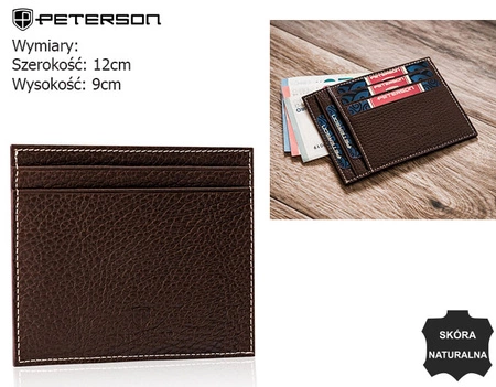 - Skórzane etui na karty marki Peterson to elegancki i praktyczny dodatek. Wykonane z wysokiej jakości skóry, wyróżnia się prostym designem i subtelnym tłoczonym logo. Kompaktowe i trwałe, idealne do codziennego użytku.