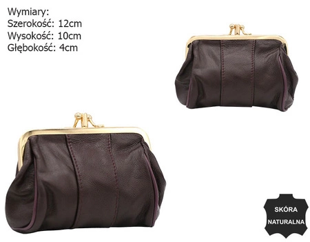 - Portmonetka ze skóry naturalnej w stylu vintage. Posiada strukturę z delikatnymi plisami. Zamykana na podwójny złoty bigiel. Wyposażony w dwie komory bez dodatkowych przegródek. Produkt No Logo.