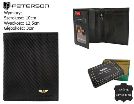 - Elegancki pionowy portfel męski bez zapięcia odszyty ze skóry naturalnej powleczonej z zewnątrz warstwą przypominającą włókno węglowe carbon. Portfel z sekcją na gotówkę, schowkiem na suwak i zakładkami na karty. Nie mieści dowodu rejestracyjnego