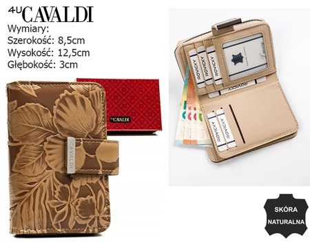 - Portfel damski ze skóry naturalnej i ekologicznej w brązowym kolorze zdobionym motywem roślinnym. Portfel wyposażony w 12 zakładek na karty i dokumenty, przegródkę na banknoty i zewnętrzną kieszeń na bilon zamykaną suwakiem. Pudełko producenta. RFID STOP