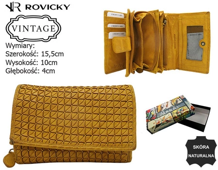 - Portfel damski skórzany w żółtym kolorze i zdobieniami 3D. Akcesorium z rozbudowanym wnętrzem na karty i dokumenty. Mieści dowód rejestracyjny. Ochrona RFID STOP. Zapakowany w pudełko producenta.
