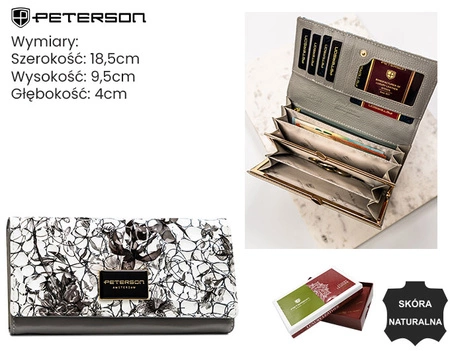 - Damski portfel skórzany Peterson wyróżnia się eleganckim, dużym logo oraz unikalnym wzorzystym frontem. Wykonany z wysokiej jakości skóry, łączy funkcjonalność z modnym designem. Zapakowany w eleganckie pudełko, świetny na prezent.