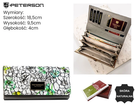 - Damski portfel skórzany Peterson wyróżnia się eleganckim, dużym logo oraz unikalnym wzorzystym frontem. Wykonany z wysokiej jakości skóry, łączy funkcjonalność z modnym designem. Zapakowany w eleganckie pudełko, świetny na prezent.