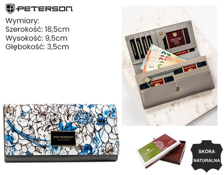 - Skórzany portfel damski marki Peterson to połączenie stylu i funkcjonalności. Oryginalny wzorzysty front i duże eleganckie logo przyciągają uwagę. Portfel zapakowany w estetyczne pudełko, doskonały jako praktyczny i stylowy prezent.