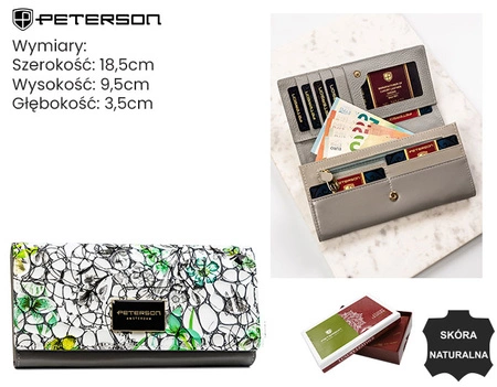 - Skórzany portfel damski marki Peterson to połączenie stylu i funkcjonalności. Oryginalny wzorzysty front i duże eleganckie logo przyciągają uwagę. Portfel zapakowany w estetyczne pudełko, doskonały jako praktyczny i stylowy prezent.