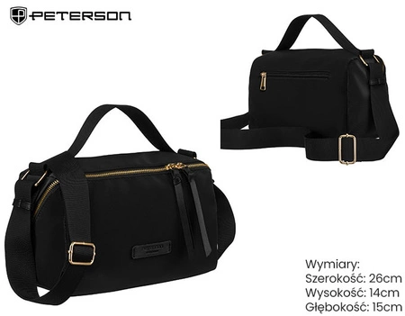 - Torebka z tkaniny poliestrowej marki Peterson to połączenie stylu i funkcjonalności. Posiada regulowany pasek i wygodną rączkę, co zapewnia komfort noszenia. Idealna na co dzień – trwała, praktyczna i modna.
