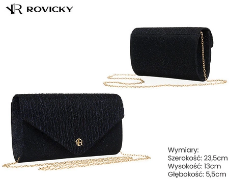 - Elegancka srebrna kopertówka Rovicky z delikatnym tłoczeniem i łańcuszkiem. Idealna na wesele, bankiet czy wieczorne wyjście. Stylowy design i kompaktowy rozmiar pomieszczą najważniejsze drobiazgi.